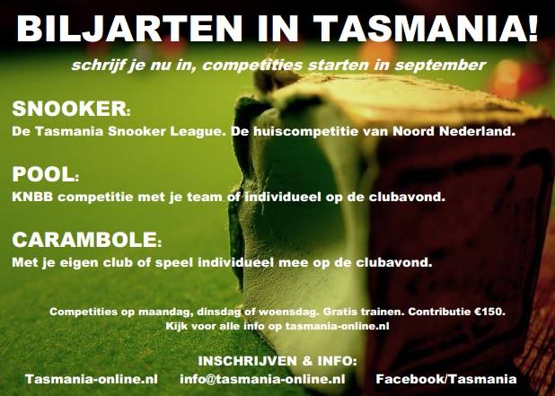 Al onze biljarts zijn in wedstrijdconditie en beschikken over wedstrijdlakens. Ook zijn er altijd biljartkeuen en krijt beschikbaar. Voor iedere biljartvorm kun je deelnemen aan de Tasmania! Huiscompetitie. Iedere discipline heeft zijn eigen speelavond. Daarnaast kunnen deelnemers van de Tasmania! Huiscompetitie gratis trainen van maandag tot en met vrijdag tussen 13:00 – 18:00 uur. Ook worden er extra activiteiten georganiseerd zoals toernooien, extra trainingsmogelijkheden en speciale deals. Schrijf je nu in.